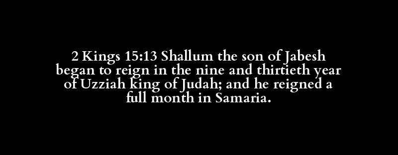 2 Kings 15:13 Shallum the son of Jabesh began to reign in the nine and thirtieth year of Uzziah king of Judah; and he reigned a full month in Samaria.