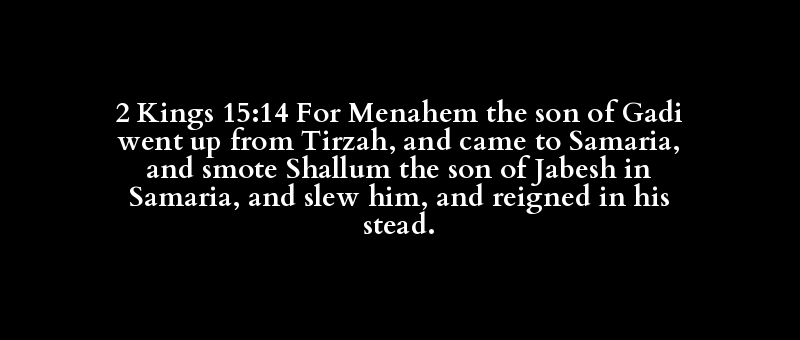 2 Kings 15:14 For Menahem the son of Gadi went up from Tirzah, and came to Samaria, and smote Shallum the son of Jabesh in Samaria, and slew him, and reigned in his stead.