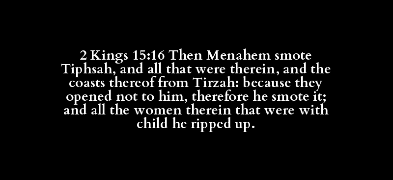2 Kings 15:16 Then Menahem smote Tiphsah, and all that were therein, and the coasts thereof from Tirzah: because they opened not to him, therefore he smote it; and all the women therein that were with child he ripped up.