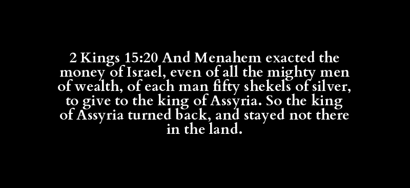 2 Kings 15:20 And Menahem exacted the money of Israel, even of all the mighty men of wealth, of each man fifty shekels of silver, to give to the king of Assyria. So the king of Assyria turned back, and stayed not there in the land.