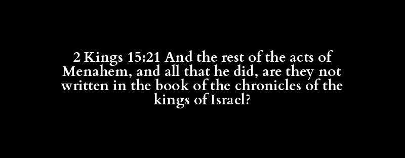 2 Kings 15:21 And the rest of the acts of Menahem, and all that he did, are they not written in the book of the chronicles of the kings of Israel?