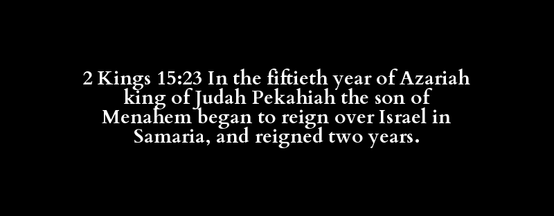 2 Kings 15:23 In the fiftieth year of Azariah king of Judah Pekahiah the son of Menahem began to reign over Israel in Samaria, and reigned two years.