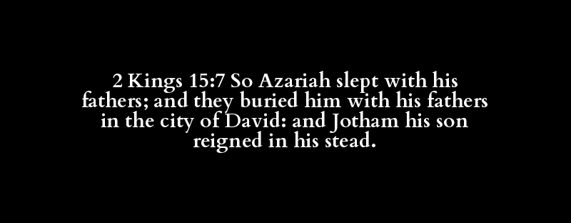 2 Kings 15:7 So Azariah slept with his fathers; and they buried him with his fathers in the city of David: and Jotham his son reigned in his stead.