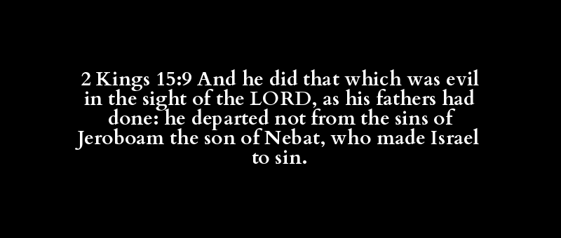 2 Kings 15:9 And he did that which was evil in the sight of the LORD, as his fathers had done: he departed not from the sins of Jeroboam the son of Nebat, who made Israel to sin.