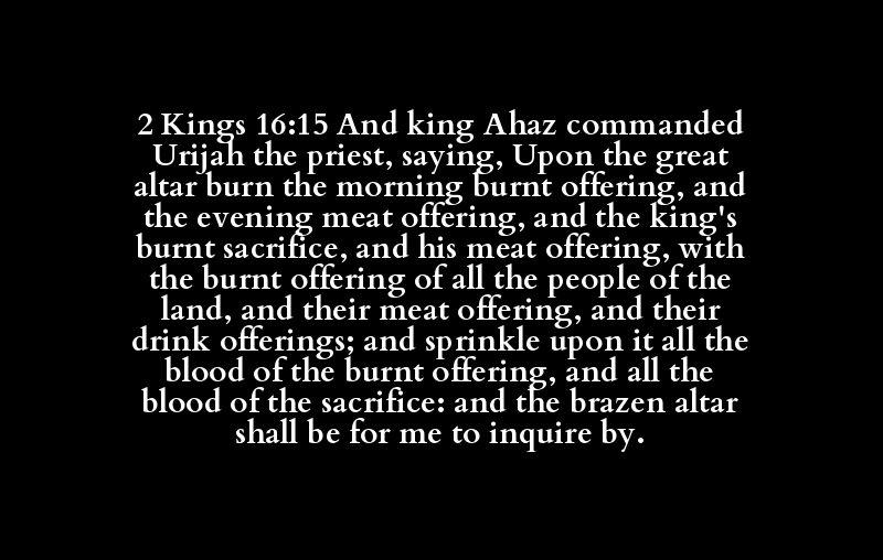 2 Kings 16:15 And king Ahaz commanded Urijah the priest, saying, Upon the great altar burn the morning burnt offering, and the evening meat offering, and the king's burnt sacrifice, and his meat offering, with the burnt offering of all the people of the land, and their meat offering, and their drink offerings; and sprinkle upon it all the blood of the burnt offering, and all the blood of the sacrifice: and the brazen altar shall be for me to inquire by.