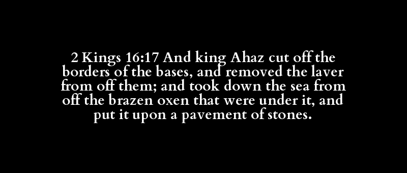 2 Kings 16:17 And king Ahaz cut off the borders of the bases, and removed the laver from off them; and took down the sea from off the brazen oxen that were under it, and put it upon a pavement of stones.
