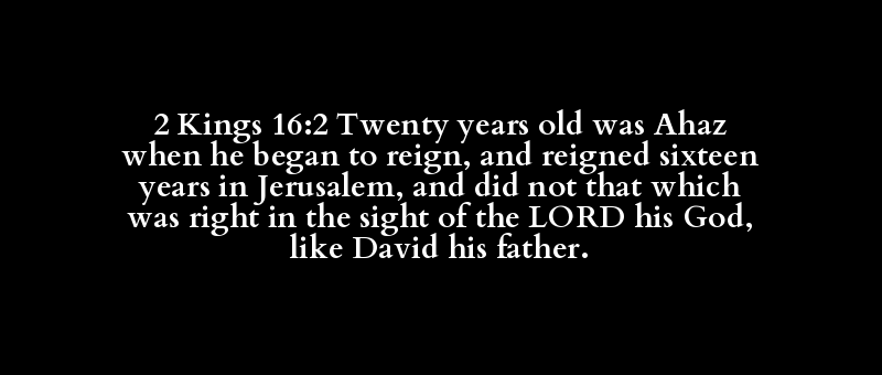 2 Kings 16:2 Twenty years old was Ahaz when he began to reign, and reigned sixteen years in Jerusalem, and did not that which was right in the sight of the LORD his God, like David his father.