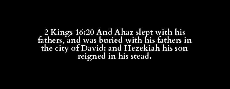 2 Kings 16:20 And Ahaz slept with his fathers, and was buried with his fathers in the city of David: and Hezekiah his son reigned in his stead.