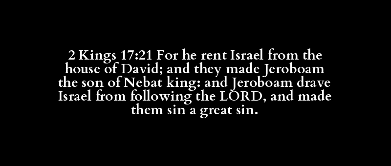 2 Kings 17:21 For he rent Israel from the house of David; and they made Jeroboam the son of Nebat king: and Jeroboam drave Israel from following the LORD, and made them sin a great sin.