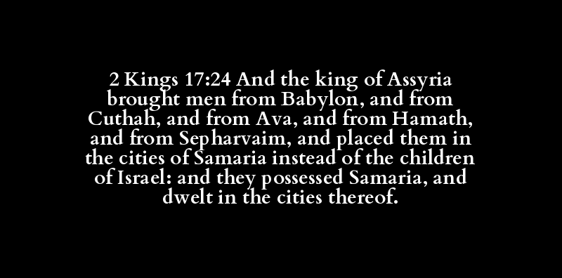 2 Kings 17:24 And the king of Assyria brought men from Babylon, and from Cuthah, and from Ava, and from Hamath, and from Sepharvaim, and placed them in the cities of Samaria instead of the children of Israel: and they possessed Samaria, and dwelt in the cities thereof.