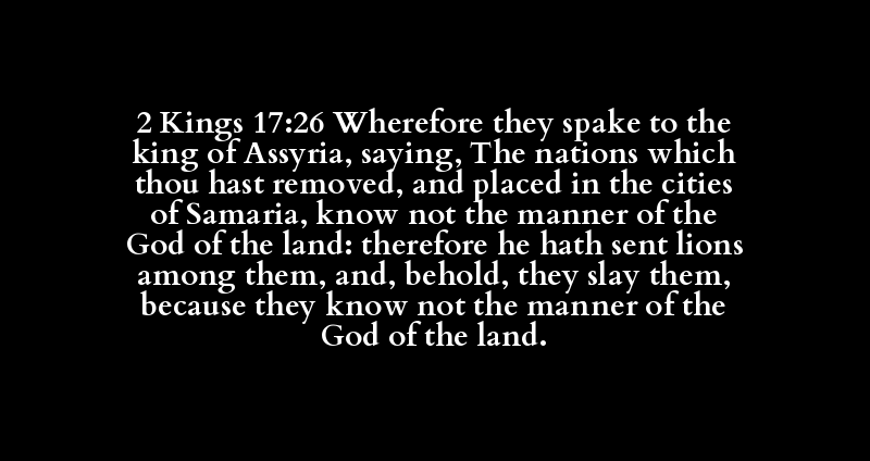 2 Kings 17:26 Wherefore they spake to the king of Assyria, saying, The nations which thou hast removed, and placed in the cities of Samaria, know not the manner of the God of the land: therefore he hath sent lions among them, and, behold, they slay them, because they know not the manner of the God of the land.