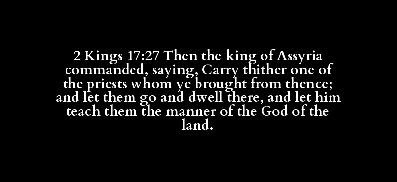 2 Kings 17:27 Then the king of Assyria commanded, saying, Carry thither one of the priests whom ye brought from thence; and let them go and dwell there, and let him teach them the manner of the God of the land.