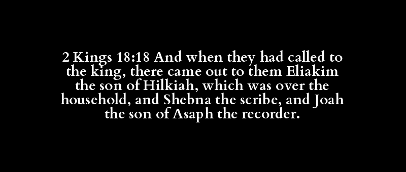 2 Kings 18:18 And when they had called to the king, there came out to them Eliakim the son of Hilkiah, which was over the household, and Shebna the scribe, and Joah the son of Asaph the recorder.