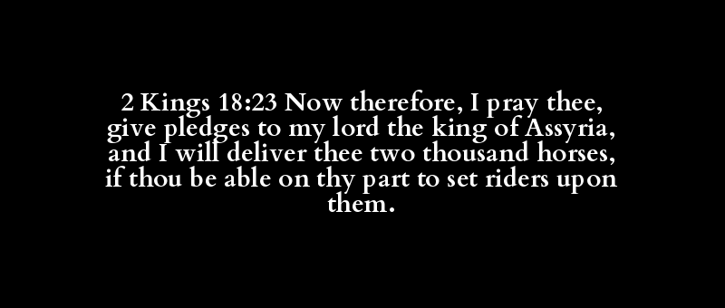 2 Kings 18:23 Now therefore, I pray thee, give pledges to my lord the king of Assyria, and I will deliver thee two thousand horses, if thou be able on thy part to set riders upon them.