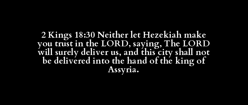 2 Kings 18:30 Neither let Hezekiah make you trust in the LORD, saying, The LORD will surely deliver us, and this city shall not be delivered into the hand of the king of Assyria.