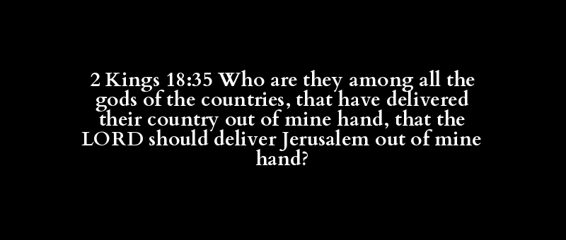 2 Kings 18:35 Who are they among all the gods of the countries, that have delivered their country out of mine hand, that the LORD should deliver Jerusalem out of mine hand?