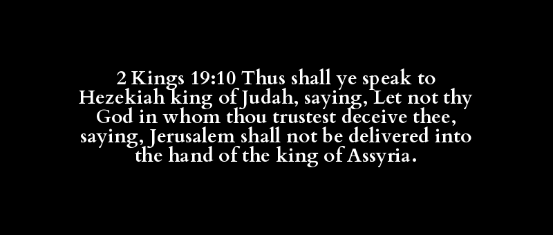 2 Kings 19:10 Thus shall ye speak to Hezekiah king of Judah, saying, Let not thy God in whom thou trustest deceive thee, saying, Jerusalem shall not be delivered into the hand of the king of Assyria.