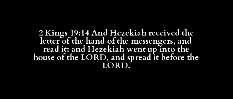 2 Kings 19:14 And Hezekiah received the letter of the hand of the messengers, and read it: and Hezekiah went up into the house of the LORD, and spread it before the LORD.