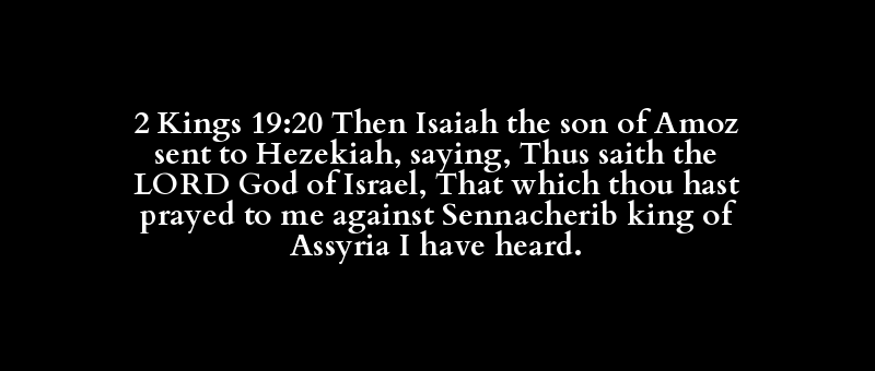 2 Kings 19:20 Then Isaiah the son of Amoz sent to Hezekiah, saying, Thus saith the LORD God of Israel, That which thou hast prayed to me against Sennacherib king of Assyria I have heard.