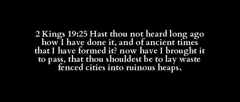 2 Kings 19:25 Hast thou not heard long ago how I have done it, and of ancient times that I have formed it? now have I brought it to pass, that thou shouldest be to lay waste fenced cities into ruinous heaps.