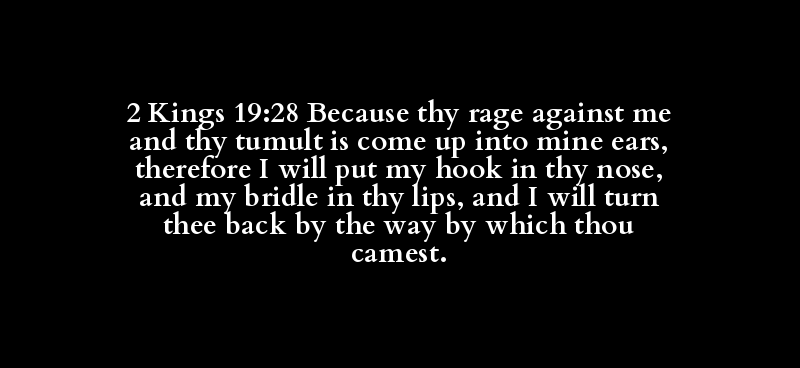 2 Kings 19:28 Because thy rage against me and thy tumult is come up into mine ears, therefore I will put my hook in thy nose, and my bridle in thy lips, and I will turn thee back by the way by which thou camest.