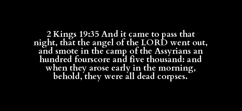 2 Kings 19:35 And it came to pass that night, that the angel of the LORD went out, and smote in the camp of the Assyrians an hundred fourscore and five thousand: and when they arose early in the morning, behold, they were all dead corpses.