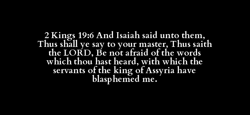 2 Kings 19:6 And Isaiah said unto them, Thus shall ye say to your master, Thus saith the LORD, Be not afraid of the words which thou hast heard, with which the servants of the king of Assyria have blasphemed me.