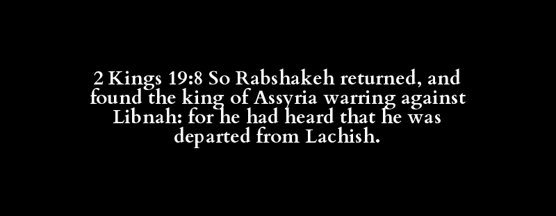 2 Kings 19:8 So Rabshakeh returned, and found the king of Assyria warring against Libnah: for he had heard that he was departed from Lachish.