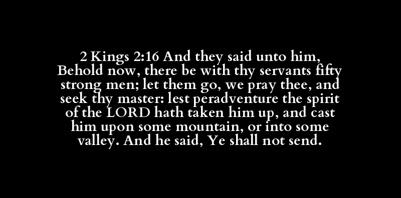 2 Kings 2:16 And they said unto him, Behold now, there be with thy servants fifty strong men; let them go, we pray thee, and seek thy master: lest peradventure the spirit of the LORD hath taken him up, and cast him upon some mountain, or into some valley. And he said, Ye shall not send.
