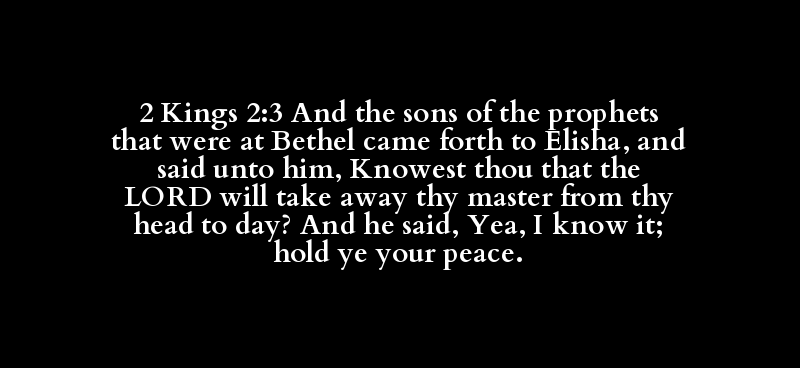 2 Kings 2:3 And the sons of the prophets that were at Bethel came forth to Elisha, and said unto him, Knowest thou that the LORD will take away thy master from thy head to day? And he said, Yea, I know it; hold ye your peace.