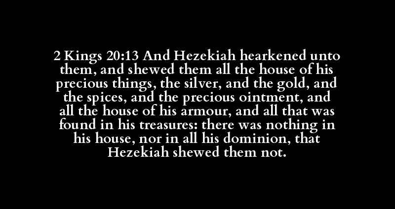 2 Kings 20:13 And Hezekiah hearkened unto them, and shewed them all the house of his precious things, the silver, and the gold, and the spices, and the precious ointment, and all the house of his armour, and all that was found in his treasures: there was nothing in his house, nor in all his dominion, that Hezekiah shewed them not.