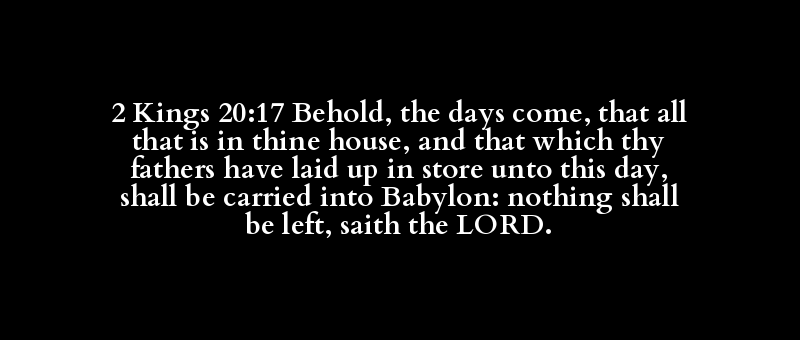 2 Kings 20:17 Behold, the days come, that all that is in thine house, and that which thy fathers have laid up in store unto this day, shall be carried into Babylon: nothing shall be left, saith the LORD.