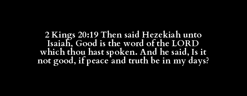 2 Kings 20:19 Then said Hezekiah unto Isaiah, Good is the word of the LORD which thou hast spoken. And he said, Is it not good, if peace and truth be in my days?
