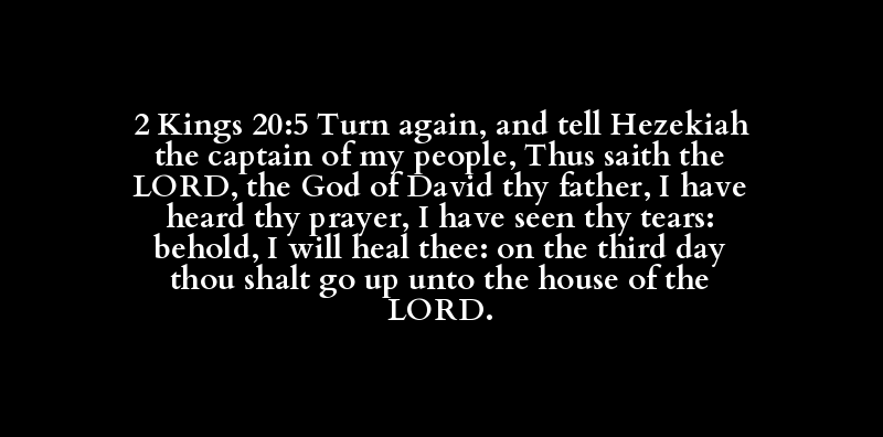 2 Kings 20:5 Turn again, and tell Hezekiah the captain of my people, Thus saith the LORD, the God of David thy father, I have heard thy prayer, I have seen thy tears: behold, I will heal thee: on the third day thou shalt go up unto the house of the LORD.