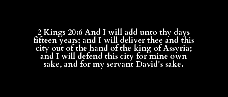 2 Kings 20:6 And I will add unto thy days fifteen years; and I will deliver thee and this city out of the hand of the king of Assyria; and I will defend this city for mine own sake, and for my servant David's sake.