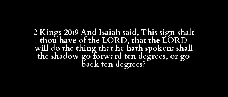2 Kings 20:9 And Isaiah said, This sign shalt thou have of the LORD, that the LORD will do the thing that he hath spoken: shall the shadow go forward ten degrees, or go back ten degrees?
