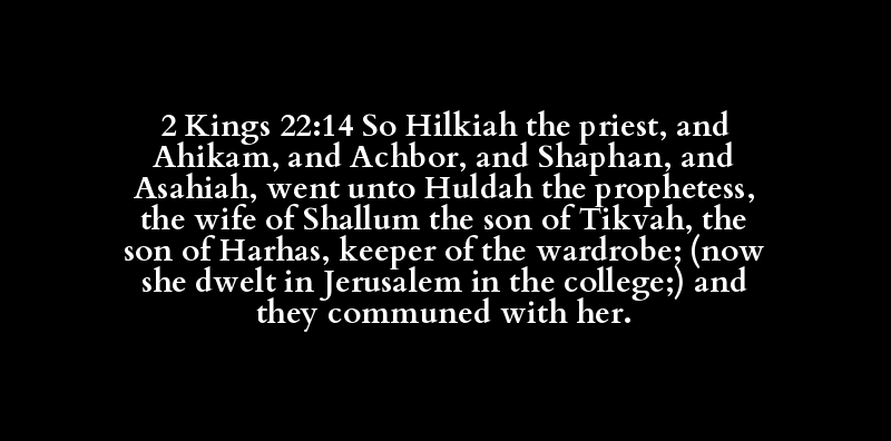 2 Kings 22:14 So Hilkiah the priest, and Ahikam, and Achbor, and Shaphan, and Asahiah, went unto Huldah the prophetess, the wife of Shallum the son of Tikvah, the son of Harhas, keeper of the wardrobe; (now she dwelt in Jerusalem in the college;) and they communed with her.
