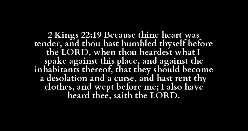 2 Kings 22:19 Because thine heart was tender, and thou hast humbled thyself before the LORD, when thou heardest what I spake against this place, and against the inhabitants thereof, that they should become a desolation and a curse, and hast rent thy clothes, and wept before me; I also have heard thee, saith the LORD.