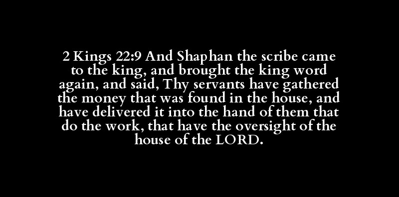 2 Kings 22:9 And Shaphan the scribe came to the king, and brought the king word again, and said, Thy servants have gathered the money that was found in the house, and have delivered it into the hand of them that do the work, that have the oversight of the house of the LORD.