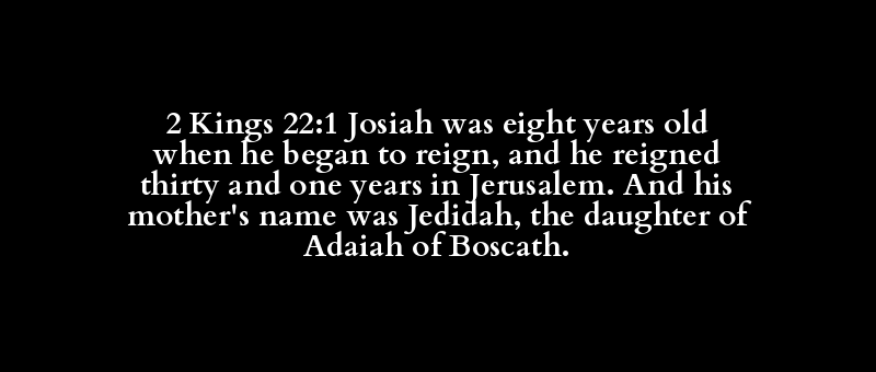 2 Kings 22:1 Josiah was eight years old when he began to reign, and he reigned thirty and one years in Jerusalem. And his mother's name was Jedidah, the daughter of Adaiah of Boscath.
