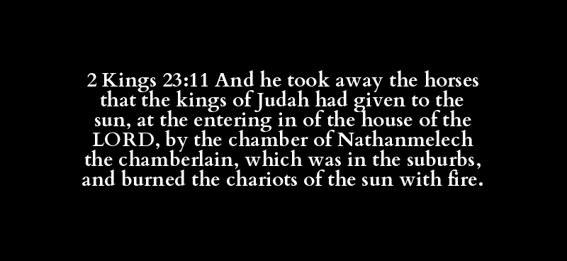 2 Kings 23:11 And he took away the horses that the kings of Judah had given to the sun, at the entering in of the house of the LORD, by the chamber of Nathanmelech the chamberlain, which was in the suburbs, and burned the chariots of the sun with fire.