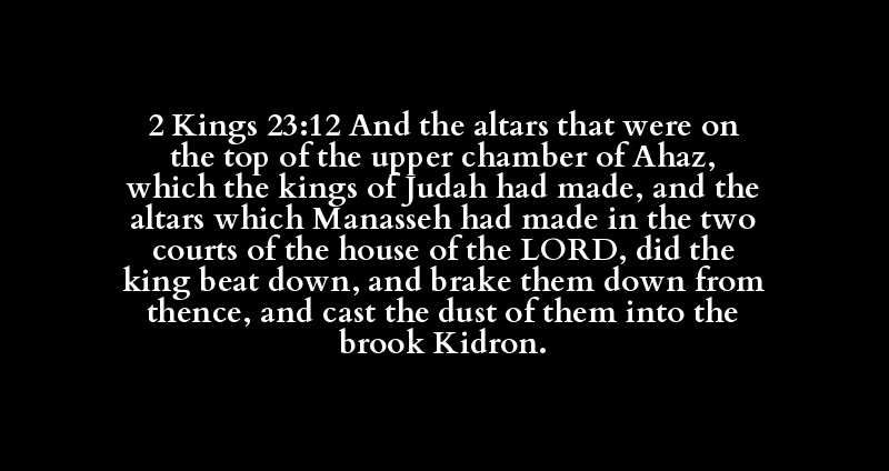 2 Kings 23:12 And the altars that were on the top of the upper chamber of Ahaz, which the kings of Judah had made, and the altars which Manasseh had made in the two courts of the house of the LORD, did the king beat down, and brake them down from thence, and cast the dust of them into the brook Kidron.