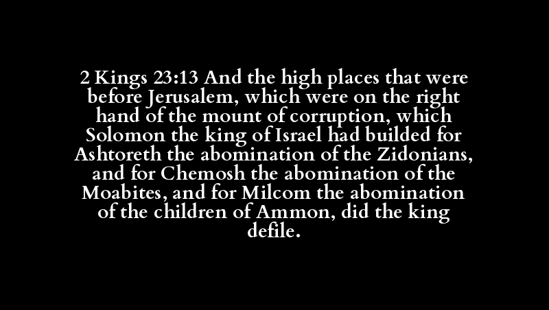 2 Kings 23:13 And the high places that were before Jerusalem, which were on the right hand of the mount of corruption, which Solomon the king of Israel had builded for Ashtoreth the abomination of the Zidonians, and for Chemosh the abomination of the Moabites, and for Milcom the abomination of the children of Ammon, did the king defile.