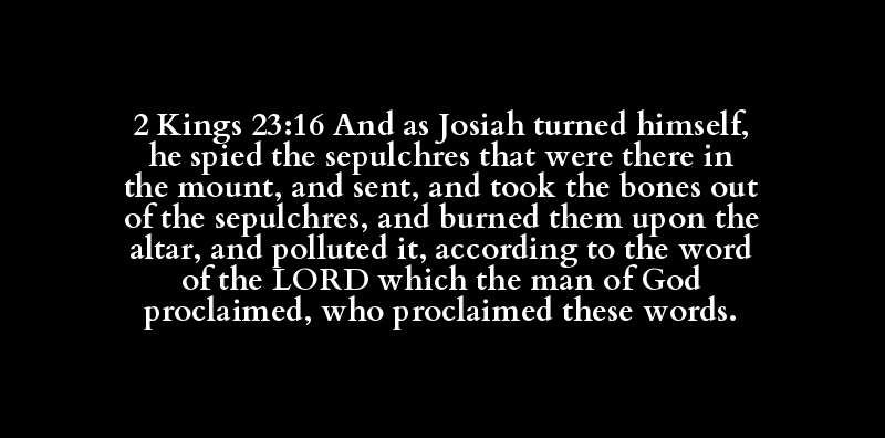 2 Kings 23:16 And as Josiah turned himself, he spied the sepulchres that were there in the mount, and sent, and took the bones out of the sepulchres, and burned them upon the altar, and polluted it, according to the word of the LORD which the man of God proclaimed, who proclaimed these words.