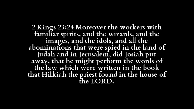 2 Kings 23:24 Moreover the workers with familiar spirits, and the wizards, and the images, and the idols, and all the abominations that were spied in the land of Judah and in Jerusalem, did Josiah put away, that he might perform the words of the law which were written in the book that Hilkiah the priest found in the house of the LORD.