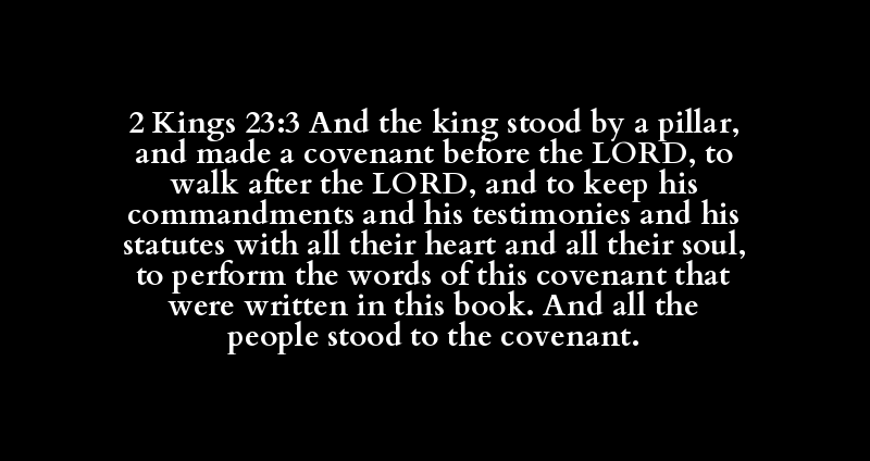 2 Kings 23:3 And the king stood by a pillar, and made a covenant before the LORD, to walk after the LORD, and to keep his commandments and his testimonies and his statutes with all their heart and all their soul, to perform the words of this covenant that were written in this book. And all the people stood to the covenant.