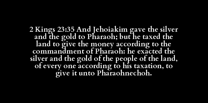 2 Kings 23:35 And Jehoiakim gave the silver and the gold to Pharaoh; but he taxed the land to give the money according to the commandment of Pharaoh: he exacted the silver and the gold of the people of the land, of every one according to his taxation, to give it unto Pharaohnechoh.