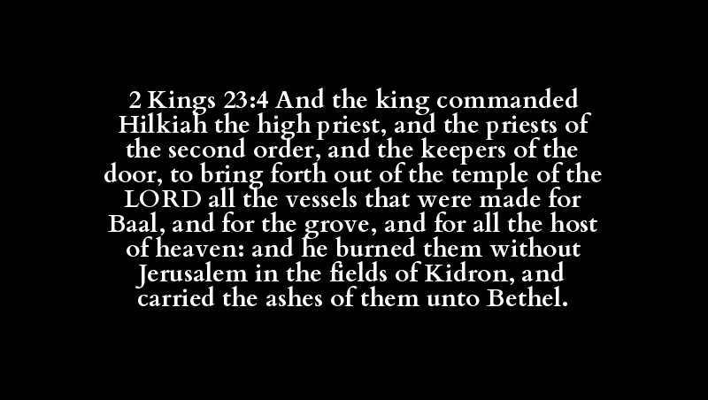 2 Kings 23:4 And the king commanded Hilkiah the high priest, and the priests of the second order, and the keepers of the door, to bring forth out of the temple of the LORD all the vessels that were made for Baal, and for the grove, and for all the host of heaven: and he burned them without Jerusalem in the fields of Kidron, and carried the ashes of them unto Bethel.
