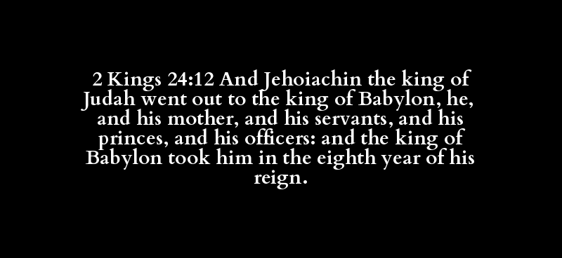 2 Kings 24:12 And Jehoiachin the king of Judah went out to the king of Babylon, he, and his mother, and his servants, and his princes, and his officers: and the king of Babylon took him in the eighth year of his reign.