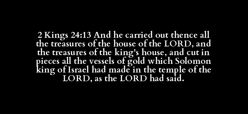 2 Kings 24:13 And he carried out thence all the treasures of the house of the LORD, and the treasures of the king's house, and cut in pieces all the vessels of gold which Solomon king of Israel had made in the temple of the LORD, as the LORD had said.